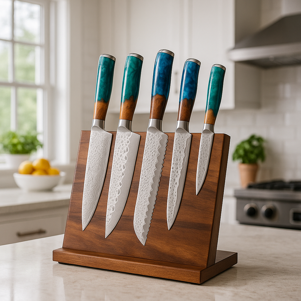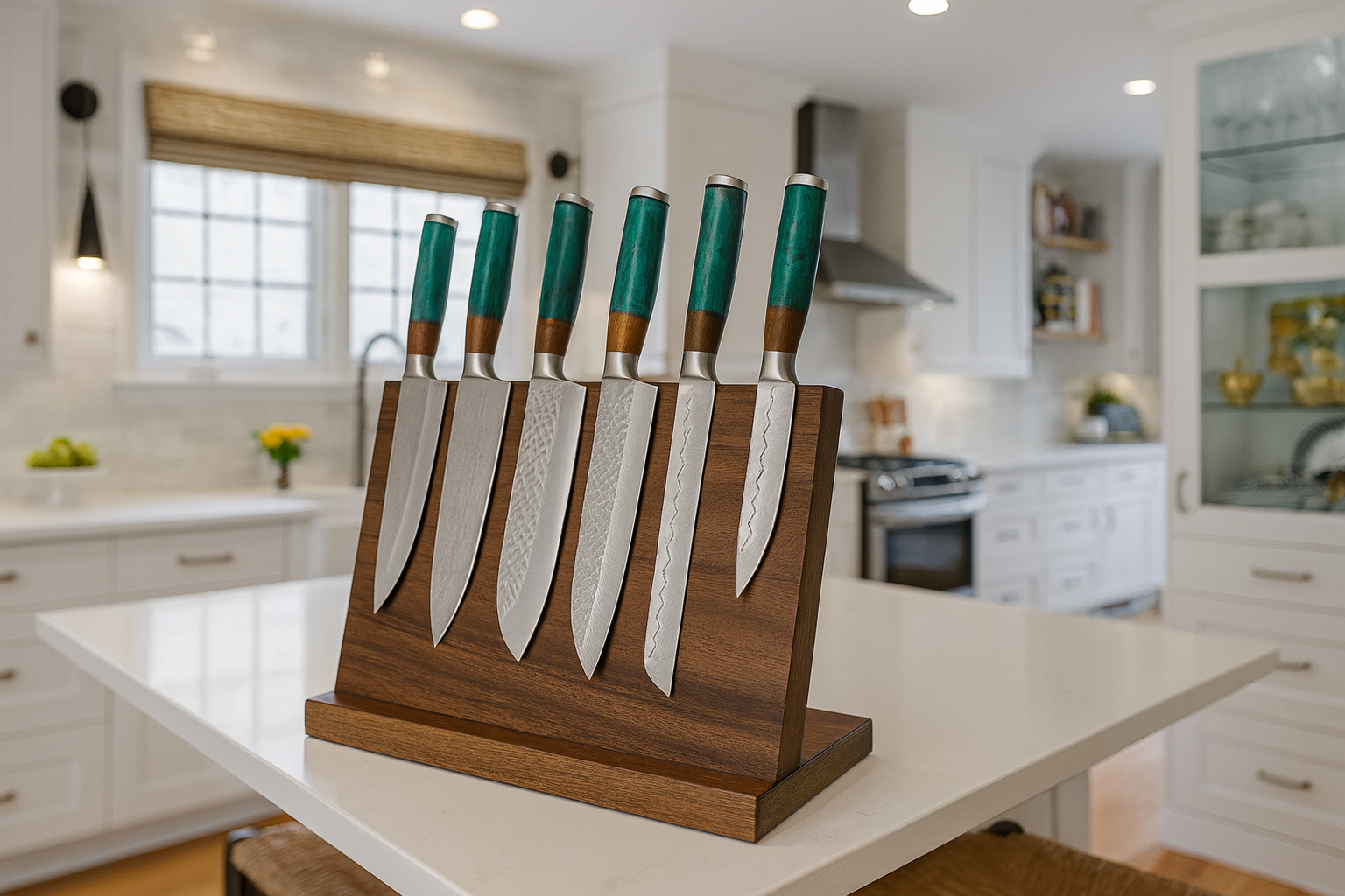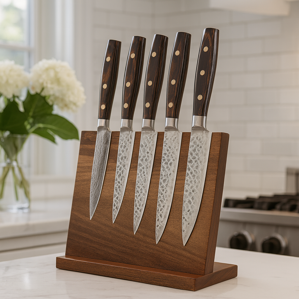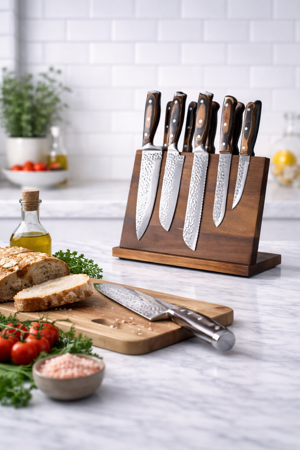 Unlike bulky slotted blocks, KitchnIQ keeps your knives visible, organized, and easily accessible. The angled profile allows one-hand retrieval, while the natural wood finish adds a premium touch to your countertop.